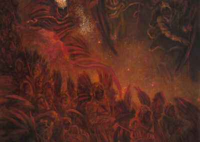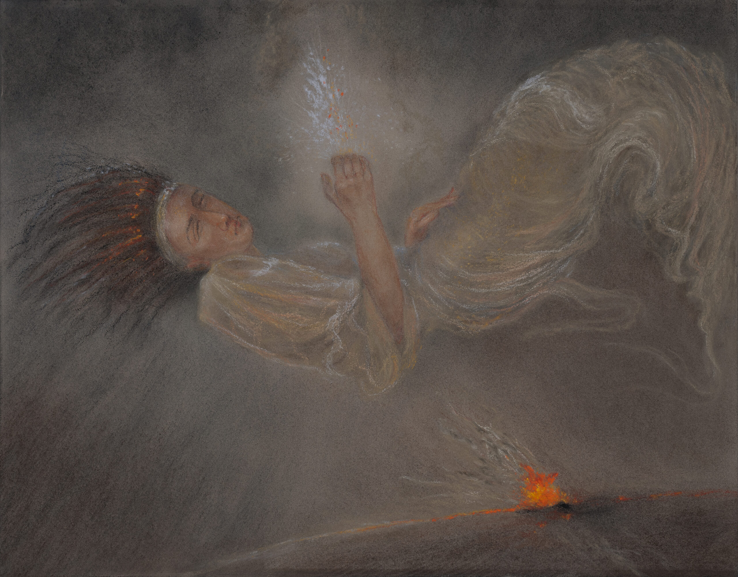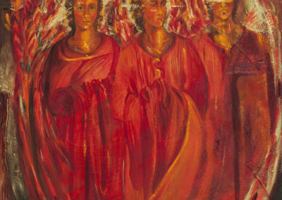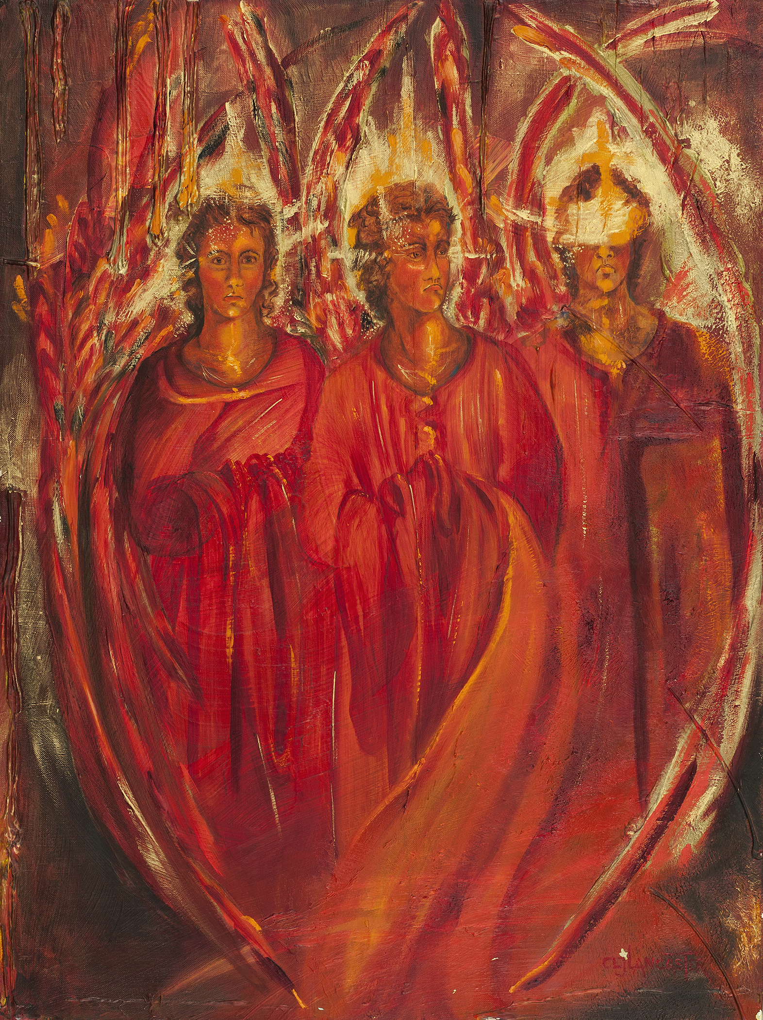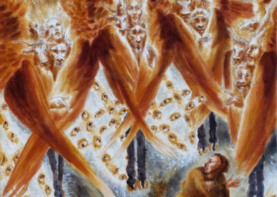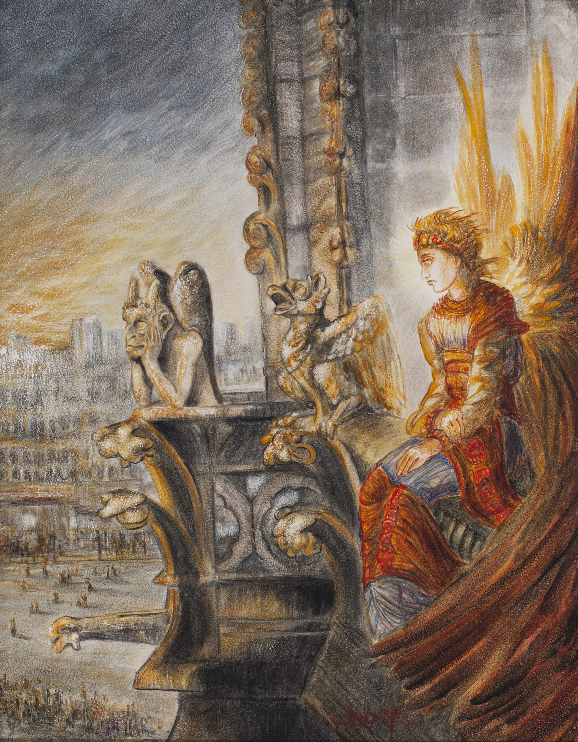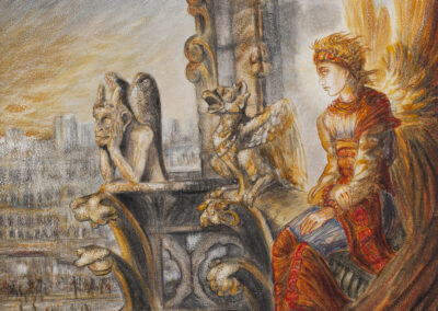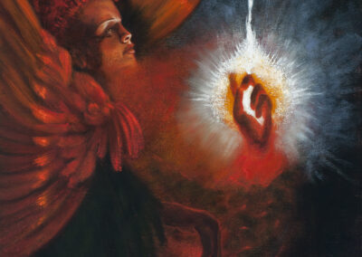 Some of the imagery I use references historical symbols in art from the past; the stag, for example, has since medieval times often been a symbol for Christ, while lilies represent purity and everlasting life. The red staff that some of my angels carry is my own symbol for love and strength.